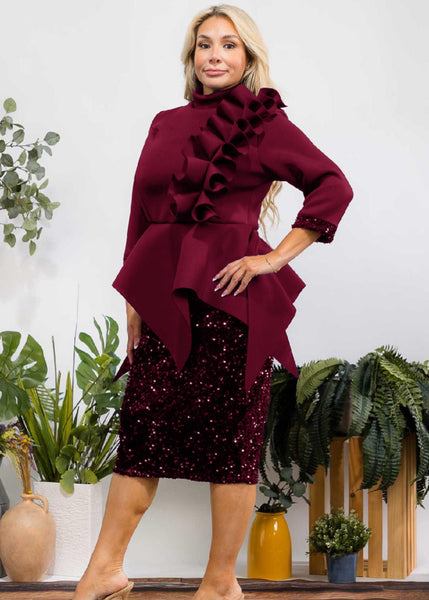One piece peplum dress. The bottom is all sequins and has lots of stretch. It’s also embellished with sequins around the sleeves. Available in Navy and Burgundy.