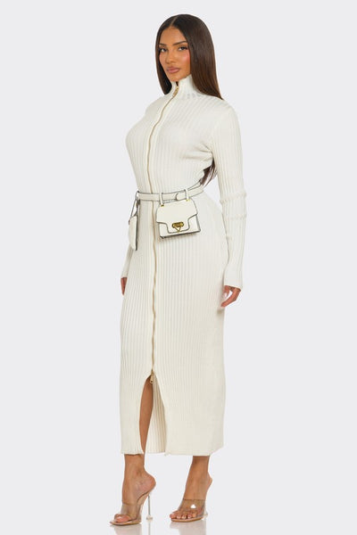 White ribbed maxi utility dress that come with removable dual pouch! Front zipper that can be adjusted.