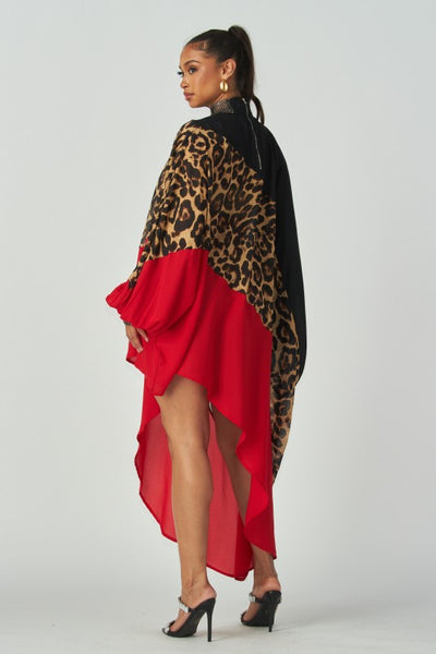 Luxe asymmetrical leopard and red chiffon shirt/dress. Rhinestones at the neck and wrist.
