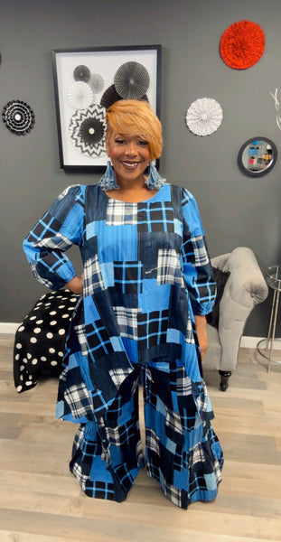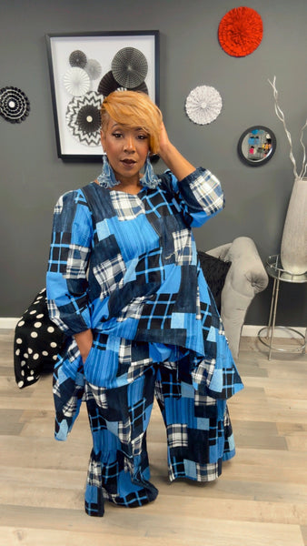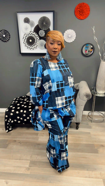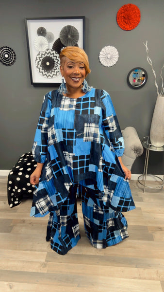 2 piece patchwork set.  Top is high/low and pants are bell.