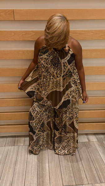 2 piece printed pleated wide leg pants set. Model’s wearing a Medium.